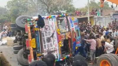 अनियंत्रित ट्रक पलटने से दो दोस्तों की मौत, आग की लपटों में जलकर खाक हुई दोनों
