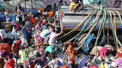 दिल्ली: जल संकट के बीच टैंकर देखते ही टूट पड़े लोग