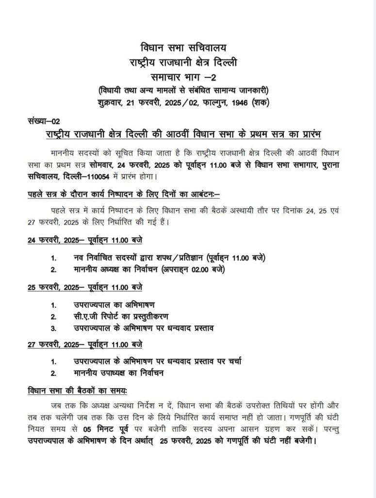 विधानसभा की ओर से जारी अधिसूचना के अनुसार, नवनिर्वाचित विधायकों को 24 फरवरी को सुबह 11 बजे से शपथ दिलाई जाएगी। सभी 70 नवनिर्वाचित विधायक विधानसभा सत्र के पहले दिन पद की शपथ लेंगे। स्पीकर पद के लिए दोपहर 2 बजे चुनाव होगा। गांधी नगर विधायक अरविंदर सिंह लवली प्रोटेम स्पीकर के रूप में स्पीकर के चुनाव की देखरेख करेंगे।