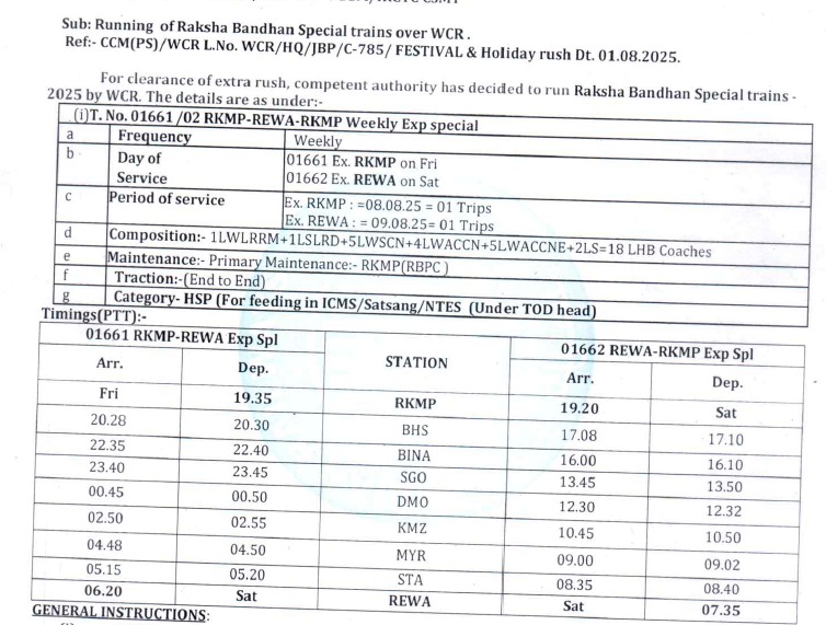 1. गाड़ी संख्या 01661 रानी कमलापति से रीवा के लिए शुक्रवार 08.08.2025 को 19:35 बजे प्रस्थान करेगी, जो अगले दिन शनिवार को 06:20 बजे रीवा पहुँचेगी।