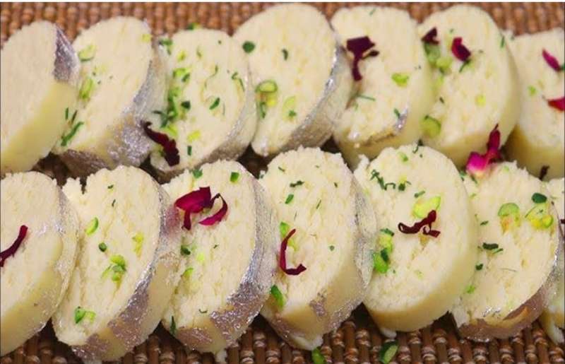 अब आपको एक बटर पेपर पर इस मिश्रण का रोल बनाना है, हलवाई से अच्छी मिठाई बनाने और दिखाई के लिए इसके ऊपर पिस्ता की कतरन डालकर पेपर पर घुला लें, ताकि सभी जगह पर चिपक जाए। इस रोल को अच्छी तरह से कवर करके फ्रिज में एक घंटे के लिए छोड़ दें। आखिरी में मिठाई को मनपसंद शेप में काट लें।