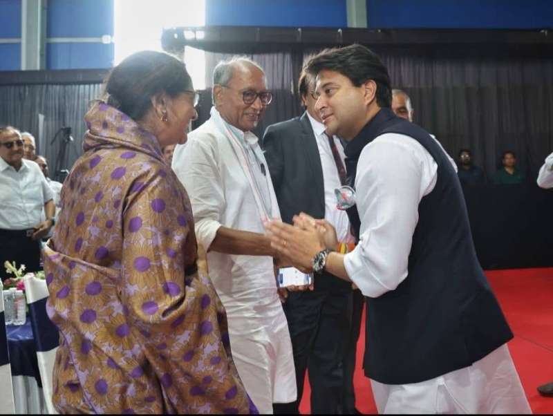 मध्य प्रदेश के दो दिग्गज नेता और राज घराने के सदस्य केंद्रीय मंत्री ज्योतिरादित्य सिंधिया और पूर्व सीएम दिग्विजय सिंह के बीच जुबानी जंग कई बार देखी जाती है. इसके उलट रक्षाबंधन से पहले भोपाल में आयोजित निजी कार्यक्रम में दोनों नेताओं का मिलन और आदर भाव चर्चाओं में है. जिस तरह कार्यक्रम के दौरान ज्योतिरादित्य सिंधिया मंच से उतर कर सामने बैठे दिग्विजय सिंह और उनके परिवार से आकर मिले और उन्हें साथ मंच तक ले गए हर कोई इस वाकये के अपने मायने निकाल रहा है.