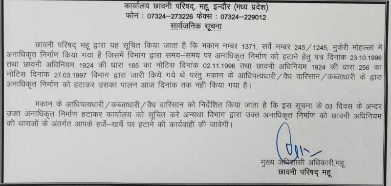 इंदौर महू। दिल्ली बम धमाके के बाद हड़कंप मचाने वाली अल-फलाह यूनिवर्सिटी के चेयरमैन और ट्रस्ट प्रमुख जवाद सिद्दीकी की मुश्किलें लगातार बढ़ती जा रही हैं। महू छावनी परिषद ने जवाद और उसके भाई हमूद सिद्दीकी के महू स्थित चार मंजिला मकान पर कार्रवाई की तलवार लटका दी है। यह घर पत्ती बाजार स्थित कायस्थ मोहल्ला में है और कैंट बोर्ड ने इसे अनधिकृत निर्माण घोषित कर दिया है। बोर्ड ने धमाके से जुड़े दस्तावेज़ों की जांच के बाद मकान पर बड़ा नोटिस चस्पा करते हुए तीन दिन में कब्जाधारी को खुद निर्माण हटाने का आदेश थमा दिया है। अल्टीमेटम साफ है निर्माण खुद गिराओ, वरना कैंट बोर्ड गिराएगा और खर्च भी तुमसे ही वसूल करेगा।छावनी क्षेत्र में इस तरह की कड़ी कार्रवाई बेहद कम देखने को मिलती है, लेकिन दिल्ली धमाके की कड़ियों ने पूरे मामले को बेहद संवेदनशील बना दिया है।