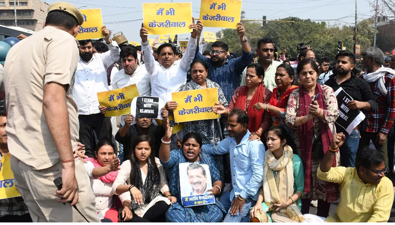 दिल्ली के मुख्यमंत्री अरविंद केजरीवाल की गिरफ्तारी के विरोध में आज मंगलवार को आम आदमी पार्टी (आप) के कार्यकर्ता प्रदर्शन कर रहे हैं।