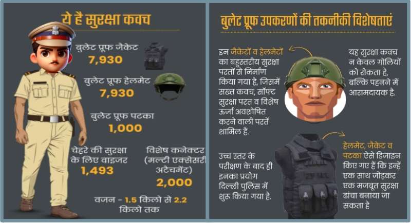 दिल्ली पुलिस को नई बुलेट-प्रूफ जैकेट, हेलमेट, पटका, चेहरा ढकने के लिए पारदर्शी सुरक्षा शिल्ड और विशेष कनेक्टर दिए जा रहे हैं, जो उनकी मल्टीलेवल सुरक्षा को सुनिश्चित करेंगे. यह कवच प्रणाली अंतरराष्ट्रीय सुरक्षा मानकों के अनुरूप है. इसे भारत सरकार के गृह मंत्रालय व पुलिस अनुसंधान एवं विकास ब्यूरो द्वारा निर्धारित मानदंडों पर परखा भी गया है.