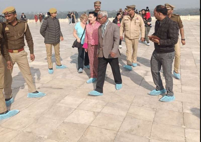 आगरा । भूटान की राजमाता शेरिंग यांगदोन ने भूटान शाही परिवार के सदस्यों के साथ ताजमहल देखा और परिसर में करीब डेढ़ घंटे तक बिताया। राजमाता ने ताज महल के अंदर शाही परिवार के साथ फोटो खिंचवाईं। भूटानी शाही परिवार को टूरिस्ट गाइड शमशुद्दीन ने ताज महल दिखाया और इसके बारे में जानकारी दी। शमशुद्दीन ने बताया कि राजमाता 30 साल पहले भी ताजमहल देखने आई थीं और यह उनकी दूसरी यात्रा है। उन्होंने बताया कि इस यात्रा के दौरान यांगदोन ने एक बार फिर ताजमहल के इतिहास के बारे में जाना। शाही परिवार के सदस्यों ने स्मारक के बारे में, इसके निर्माण और नक्काशी सहित कई सवाल भी पूछे। ‘‘वे ताजमहल की खूबसूरती को लेकर बहुत उत्सुक थे। वहीं, ताज सुरक्षा के सहायक पुलिस आयुक्त (एसीपी) सैयद अरीब अहमद ने बताया कि भूटान के शाही परिवार की यात्रा प्रोटोकॉल के तहत तय की गई थी। प्रोटोकॉल के अनुसार उन्हें पूरी सुरक्षा मुहैया कराई गई थी।