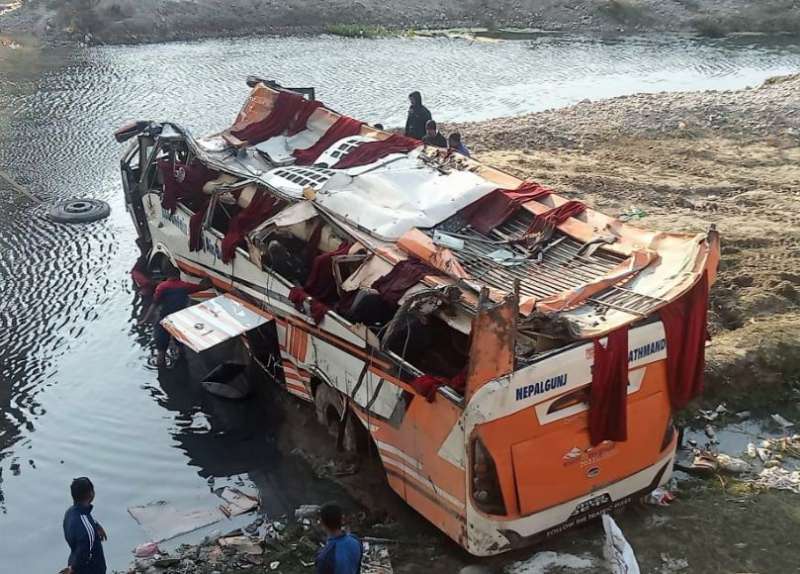 कांठमांडू । नेपाल पुलिस ने पुष्टि की है कि मध्य-पश्चिमी नेपाल के डांग जिले में सड़क दुर्घटना में दो भारतीय नागरिकों सहित कम से कम 12 लोगों की मौत हुई है। दुर्घटना में अब तक केवल आठ मृतकों की पहचान हो सकी है। पुलिस ने कहा कि यात्री बस बांके के नेपालगंज से काठमांडू जा रही थी, लेकिन यह पुल से फिसल गई और राप्ती नदी में गिर गई। हम लोगों ने केवल आठ मृत यात्रियों की पहचान की है, जिसमें दो भारतीय भी शामिल हैं।