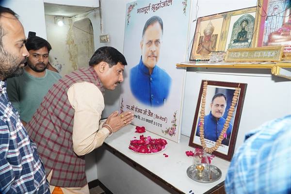 मुख्यमंत्री डॉ. मोहन यादव ने बुधवार को उज्जैन में श्री सपन जैन के निवास वीडी मार्केट पहुंचकर उनके पिता स्व. संजय कुमार जैन के चित्र पर पुष्प अर्पित कर श्रद्धांजलि दी। उन्होंने शोक संतप्त परिजन से भेंटकर ढांढस बंधाया और शोक संवेदनाएं व्यक्त की।