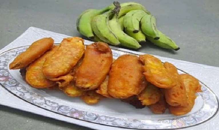 सामग्री- 1 बड़ा हरा कच्चा केला,2 बड़े चम्मच चावल का आटा,1/4 छोटा चम्मच हल्दी,आवश्यकता अनुसार नमक,1 कप सरसों का तेल,3/4 कप बेसन,1/2 छोटा चम्मच बेकिंग सोडा,1/2 छोटा चम्मच लाल मिर्च पाउडर,1/4 कप पानी