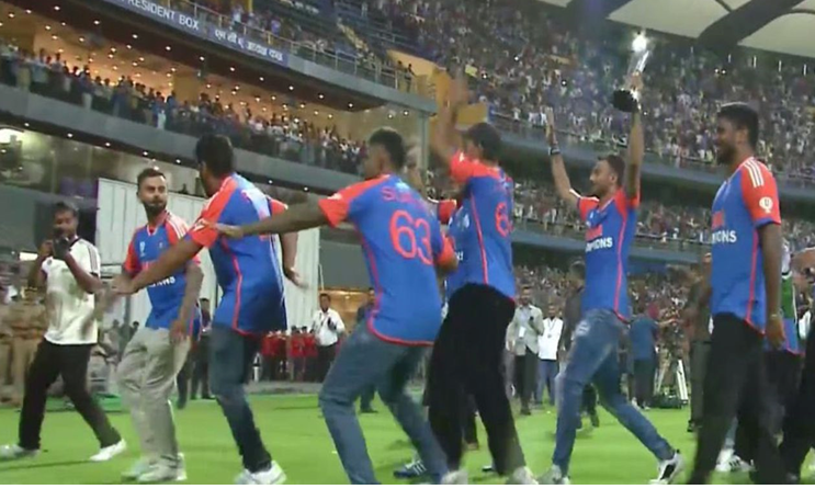 भारतीय टीम ने वैसे हर जगह ही माहौल जमाया, लेकिन मुंबई के वानखेड़े में कुछ अलग ही नज़ारे देखने को मिले. मुंबई की मरीन ड्राइव पर हुई विक्ट्री परेड के बाद वानखेड़े स्टेडियम में टीम इंडिया के लिए सम्मानित समारोह का आयोजन हुआ. इस आयोजन में कई ऐतिहासिक पल देखने को मिले, जैसे टीम इंडिया को BCCI ने अब तक की सबसे बड़ी 125 करोड़ रुपये की प्राइज़ मनी दी. इसके अलावा वानखेड़े में कुछ मस्ती भरे पल भी दिखाई दिए, जिसमें विराट कोहली और रोहित शर्मा समेत पूरी टीम शामिल रही.