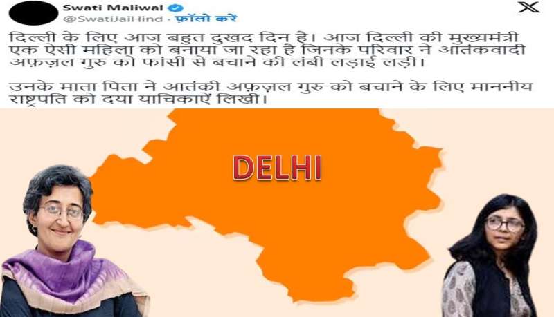 स्वाति ने सोशल मीडिया हैंडल "X" पर पोस्ट कर कहा, 'दिल्ली के लिए आज बहुत दुखद दिन है। आज दिल्ली की मुख्यमंत्री एक ऐसी महिला को बनाया जा रहा है जिनके परिवार ने आतंकवादी अफजल गुरू को फांसी से बचाने की लंबी लड़ाई लड़ी। उनके माता-पिता ने आतंकी अफजल गुरू को बचाने के लिए माननीय राष्ट्रपति को दया याचिकाएं लिखीं।' स्वाति ने कहा, 'उनके हिसाब से अफजल गुरू निर्दोष था और उसको राजनीतिक साजिश के तहत फंसाया गया था। वैसे तो आतिशी मार्लेना सिर्फ़ ‘Dummy CM’ हैं, फिर भी ये मुद्दा देश की सुरक्षा से जुड़ा हुआ है। भगवान दिल्ली की रक्षा करें!'