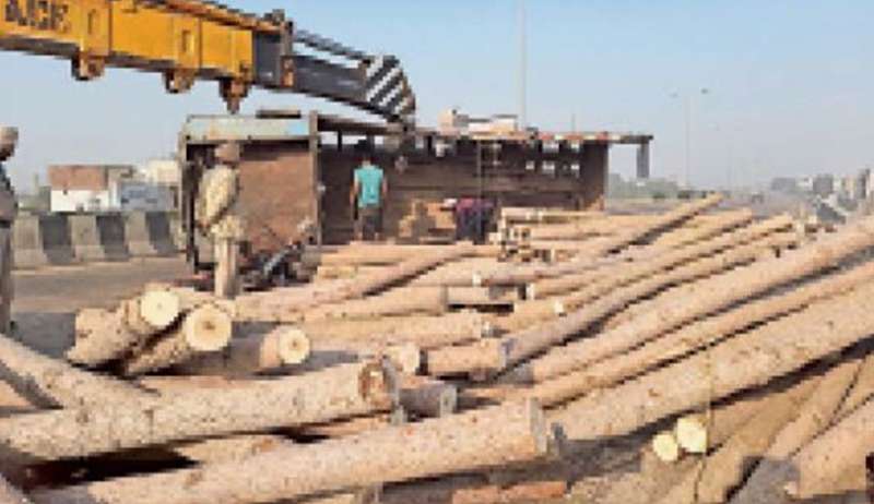 हाईवे पर लकड़ियों से भरा ट्रक पलटा, बाल-बाल बचा चालक