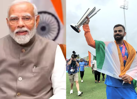किंग कोहली ने पीएम मोदी संग पूरी टीम की तस्वीर शेयर की हैं, जिसमें रोहित शर्मा और राहुल द्रविड़ पीएम मोदी को ट्रॉफी सौंप रहे हैं। इसके अलावा कोहली ने पीएम मोदी के साथ अपने एक फोटो शेयर की है, जिसमें वह उनसे हाथ मिलाते हुए नजर आ रहे हैं।