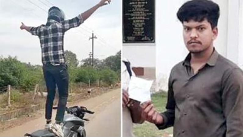 चलती बाइक पर युवक ने किया खतरनाक स्टंट, पुलिस ने काटा चालान