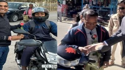हेलमेट पहनने वालों को गुलाब का फूल देकर प्रोत्साहित किया गया, नियमों का पालन करने की अपील की गई