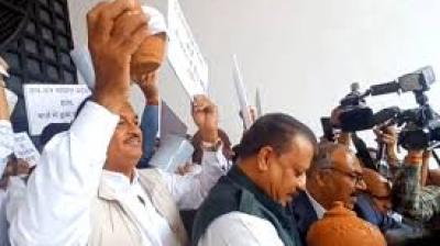 विधानसभा के बाहर खाली गुल्लक के साथ विपक्ष का प्रदर्शन